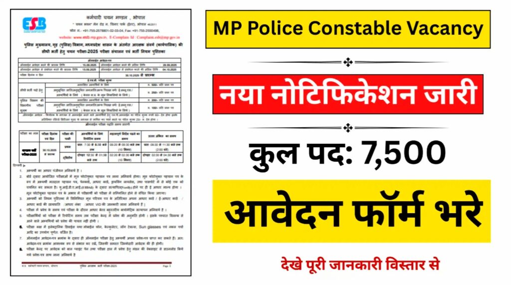 MP Police Constable Exam City Intimation Slip 2025: वे सभी 8वीं या 10वीं पास उम्मीदवार जिन्होंने मध्य प्रदेश कर्मचारी चयन मंडल के तहत मध्य प्रदेश पुलिस मे कॉन्स्टेबल / सिपाही के पदों पर नौकरी प्राप्त करने के लिए एम.पी कर्मचारी चयन मंडल द्धारा MP Police Constable Vacancy 2025 मे अप्लाई किया है और एग्जाम सिटी स्लीप के जारी होने का इंतजार कर रहे है तो आपके लिए अच्छी खबर है कि, जल्द ही मंडल द्धारा MP Police Constable Exam City Intimation Slip 2025 को जारी किया जाने वाला है जिसकी आपको लाईव अपडेट प्रदान की जाएगी।